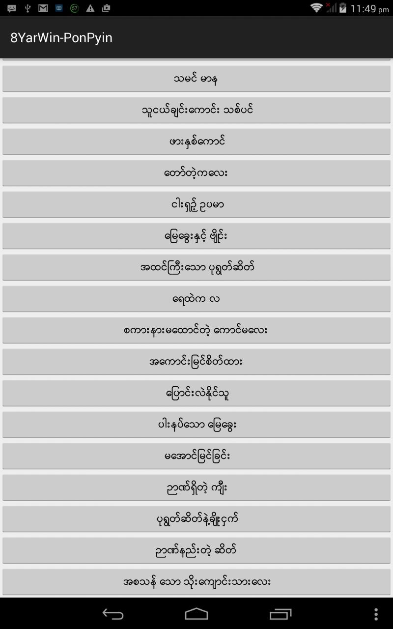 Note: New version 2, we use unicode Myanmar font. Hopefully, Android version 4.2.2 users might able to read Myanmar font. Feedback is highly appreciated.