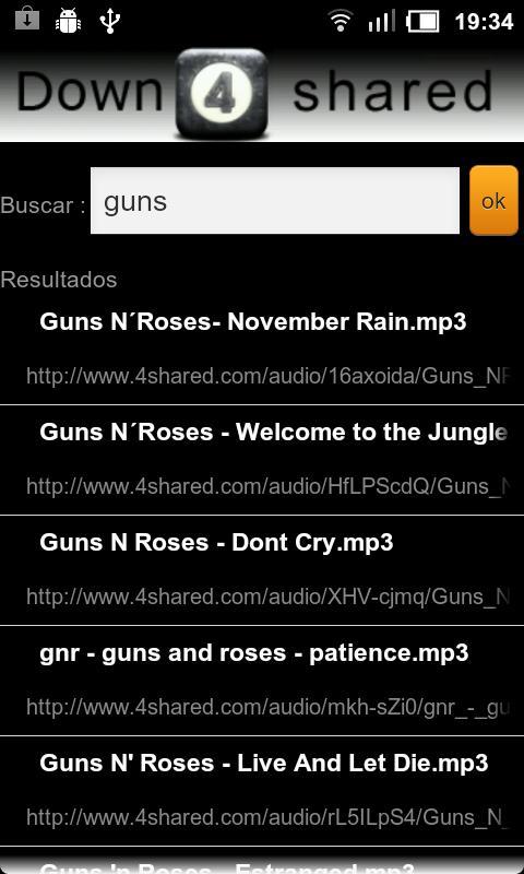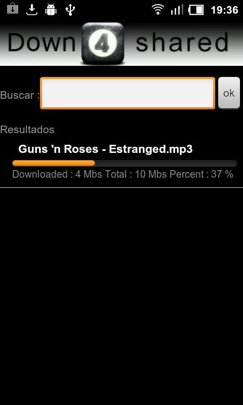 Down4Shared is an application to search files (in first version, only music files) from 4shared and download it to your android device without any account. It's as simple as putting your favourite song/artist on search box, pressing ok, waiting while the result list gets filled and clicking on the list item that you want to download. After doing that you will see a progress bar in this item, but you will have to wait a few seconds before download starts (4shared limitation). It's fully integrated with Gingerbread Download Manager, so downloads go to sdcard ('download' folder).