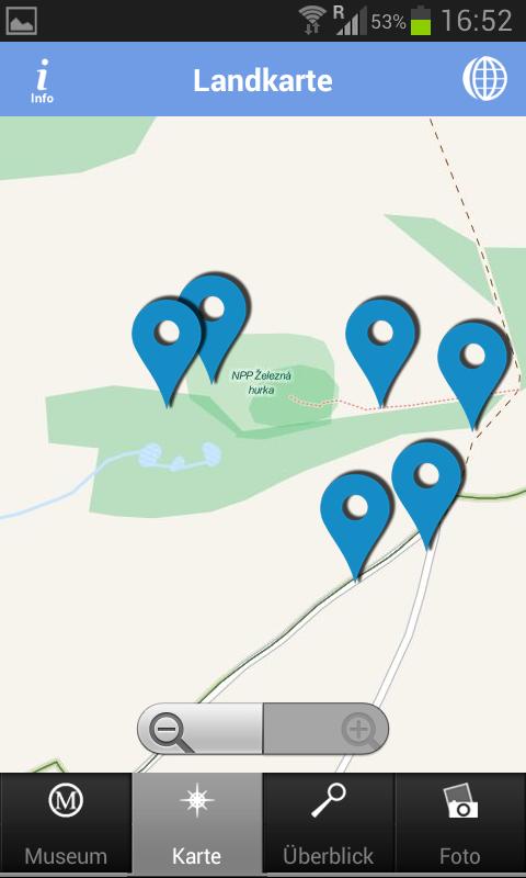 The zoomable, detailed map material opens up the content in the landscape. The map shows the city of Marktredwitz and disappeared villages in the nearby border area. The content is available offline, an internet connection is not necessary. The individual POIS (Points of Interest) can also be accessed manually via the card. Video, audio and text/image information are available. The integrated GPS function with Alert (= call tone) facilitates navigation on site.