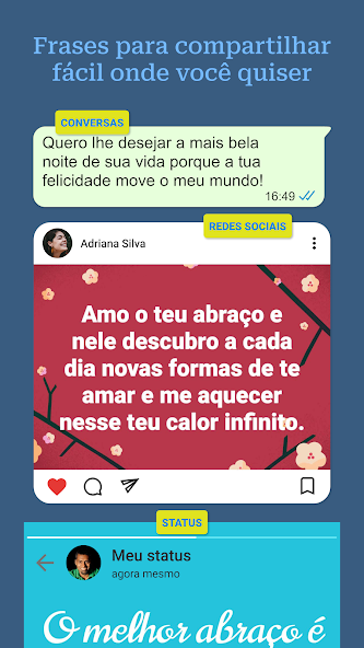One of the oldest apps on the market, it has a complete base of categories with thousands of beautiful love phrases, good morning, good afternoon, good night, motivation, status, happy birthday, pull up, wisdom, reflection, friendship, religious, sung , quotes and more.