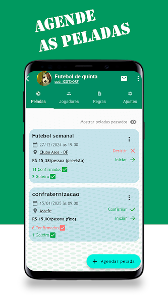 Create groups to organize your matches. Schedule games with date, time, location, number of players and much more. Your friends can confirm attendance directly through the app!