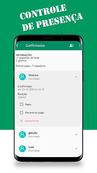 Manage your team's finances in a practical way! It is now possible to view the group's income and expenses, control payments per player, manage monthly fees and monitor who has already paid and who still needs to pay. Only administrators and controllers can access and edit this information.