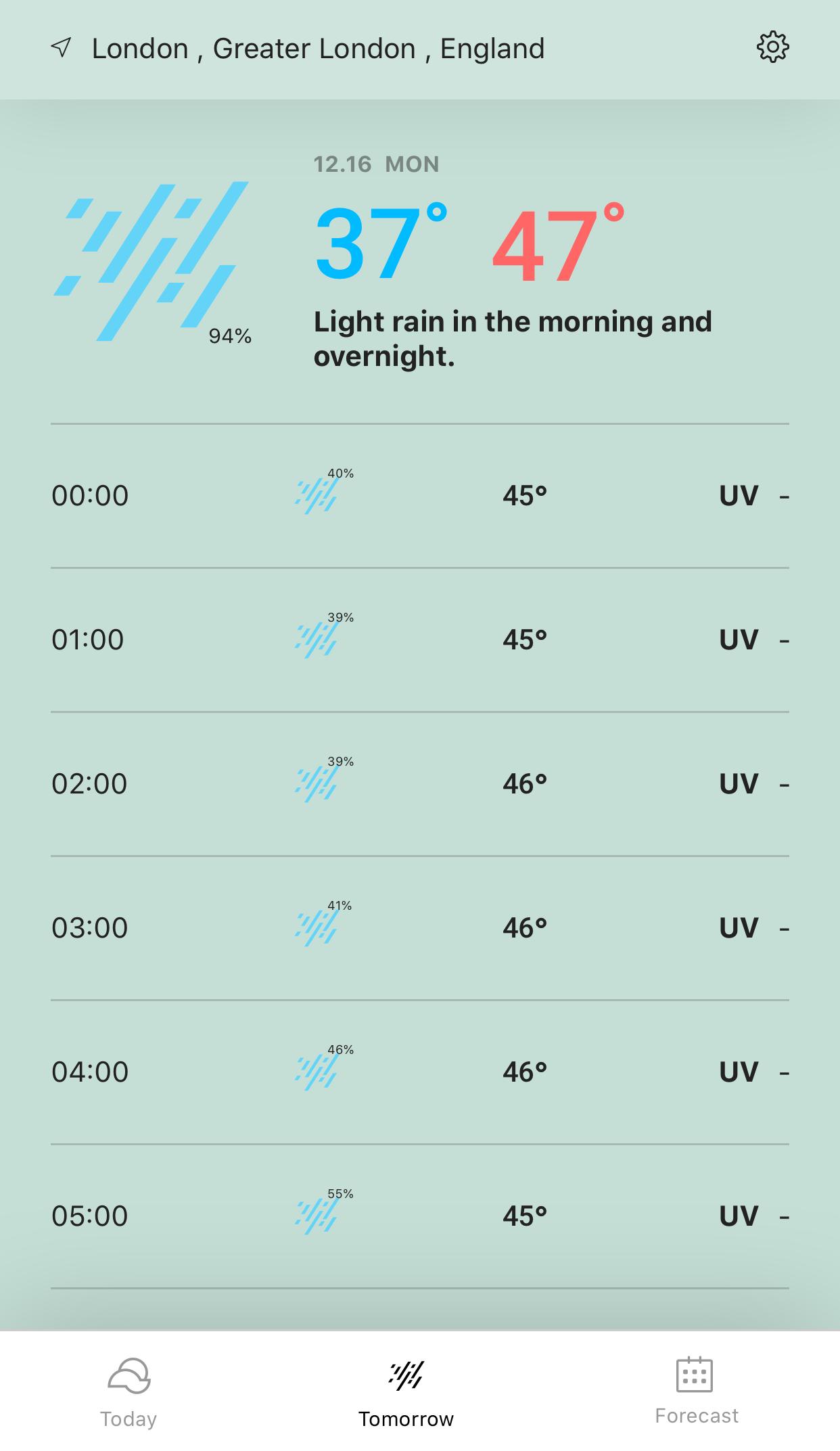 Quickly switch today, tomorrow and coming up week weather forecast by swiping left and right. Simply scroll up and down to browse hourly or daily weather.