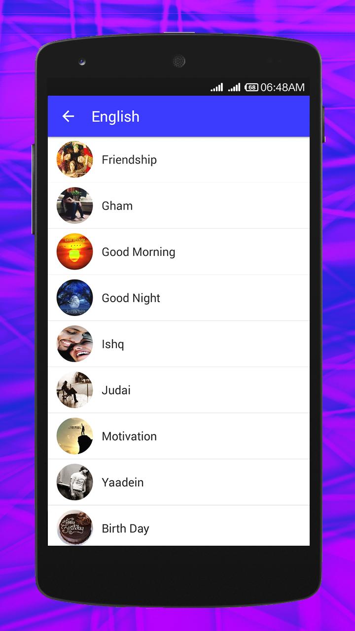 Like whenever you want to say Good Morning or Good Night through SMS to your friends, Love One or your dearest & nearest. you don't need to search SMS in your SMS or Internet just open Shuffle SMS application and select the Good Morning, Good Night, Friendship, Quotes, Love SMS or any category and select SMS which you want to send.