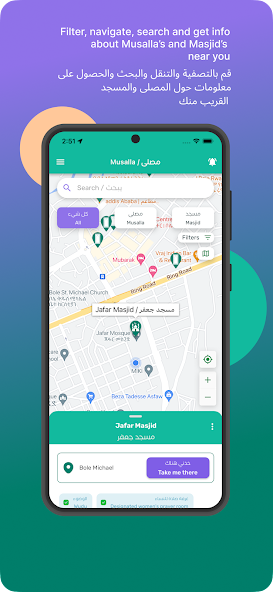 Upon launching the app, an intuitive map interface displays the Musallas and masjids in your vicinity. The markers provide an overview of each location, allowing you to quickly identify places of interest. By selecting a specific marker, you gain access to comprehensive details about the chosen site.