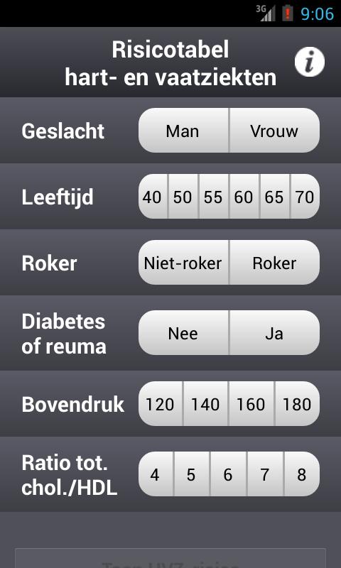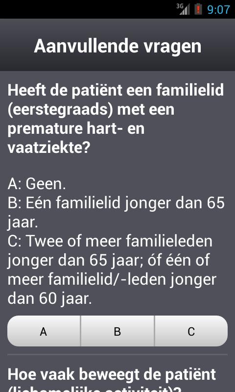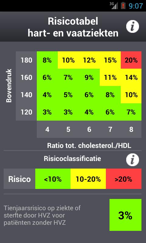 Quickly determine the ten-year risk of disease or mortality due to cardiovascular disease for patients without cardiovascular disease. The risk shown is based on the Risicotabel from the multidisciplinary guideline 'cardiovascular risk management', revision 2011. Depending on the risk shown, lifestyle and any medication advice are shown. The app is intended for medical professionals.