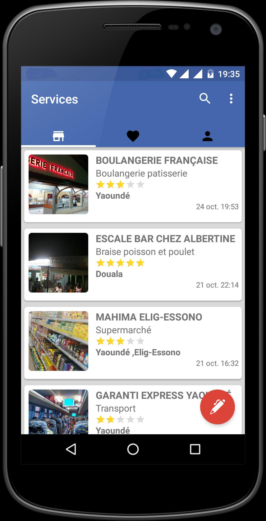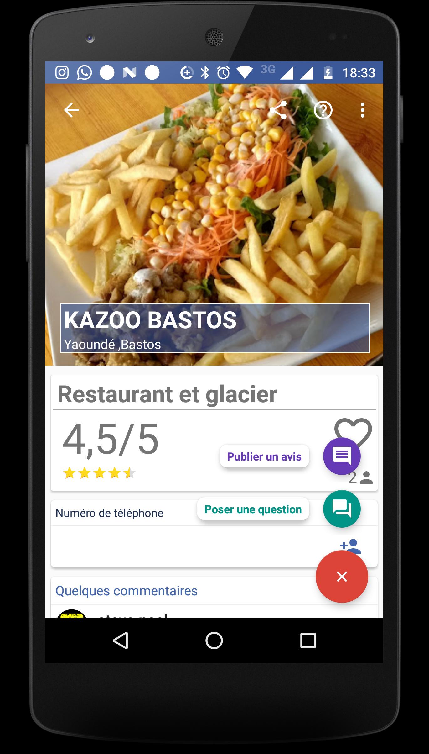 ** Easily search for restaurants, snack bars, hotels, and more by location, name (eg JC, kazoo, st-tropez), service (fish, chicken, embers, roti, chicken dg, pizza), city (Yaoundé, Douala)