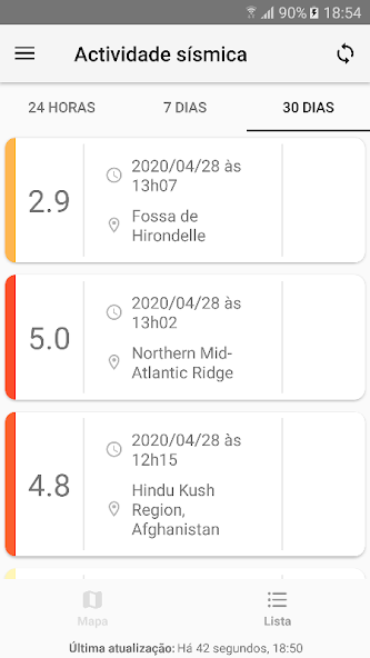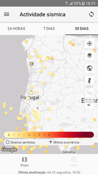 The information on the seismicity contained in this APP is generated by the seismic surveillance system of the IPMA, distributed by the Operational Centers of the Mainland and the Azores, using the national seismic network installed in the Mainland and in the archipelagos of the Azores and Madeira, which is complemented with seismic stations belonging to other international agencies. With regard to earthquakes with a distant origin from the national territory, only information is available from those recorded by the instrumentation of the seismic network operating in Portugal, typically only those of magnitude greater than 5.0.