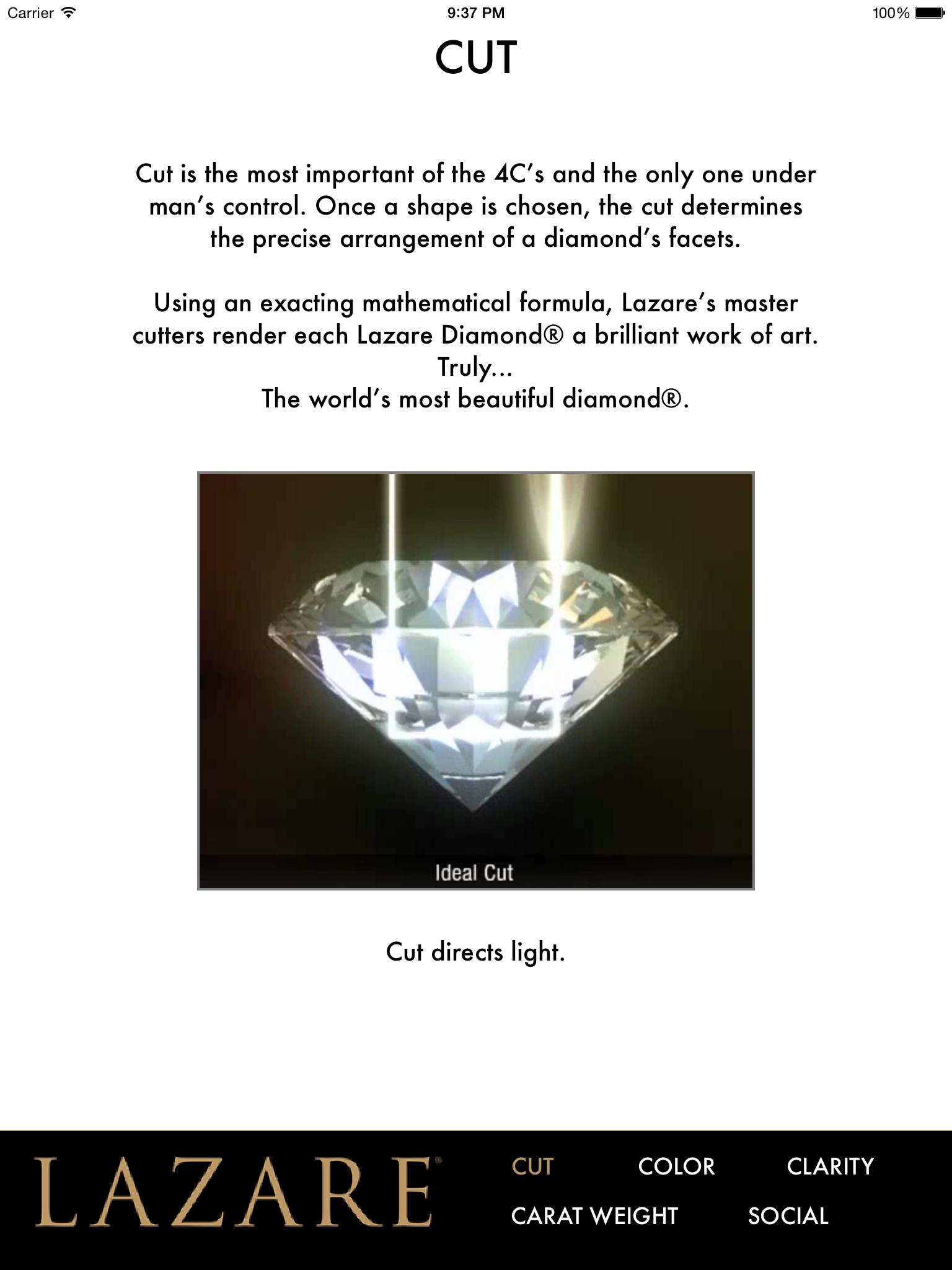 The Lazare Diamond® App demonstrates the interactive 4C’s of buying a diamond. It also serves as the ideal sales tool for retailers and sales associates interested in teaching the qualities of Cut, Color, Clarity and Carat Weight.