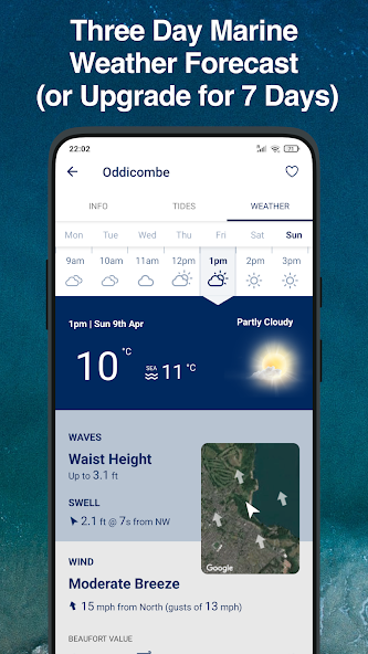 - Current weather conditions and forecast (including wave heights, swell and wind directions, air and water temperatures).
