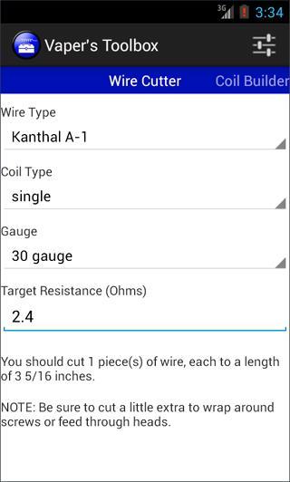 1. Wire Cutter helps you calculate how long each piece of coil wire needs to be to achieve the proper resistance. Supports single, dual, triple, and quad coil design. Wire types supported are Kanthal (A-1, A, and D), Nichrome (60 and 80), SS (304, 316, 316L), NI200, and T1 as well as Kanthal A-1 Ribbon wire. It can also display calculated lengths in inches, cm, mm, and even fractional inches (4 3/16).