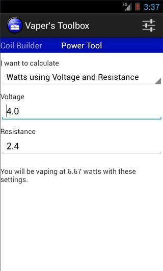 3. Power Tool calculates either voltage or wattage at which you are vaping based on your inputs and setting.