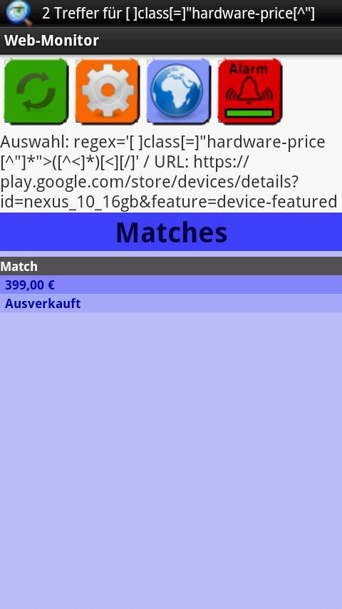 All Matches of the regex are collected and shown in a table. If the Alarm-Button is activated an alarm (notification) appears if the selected content changes.