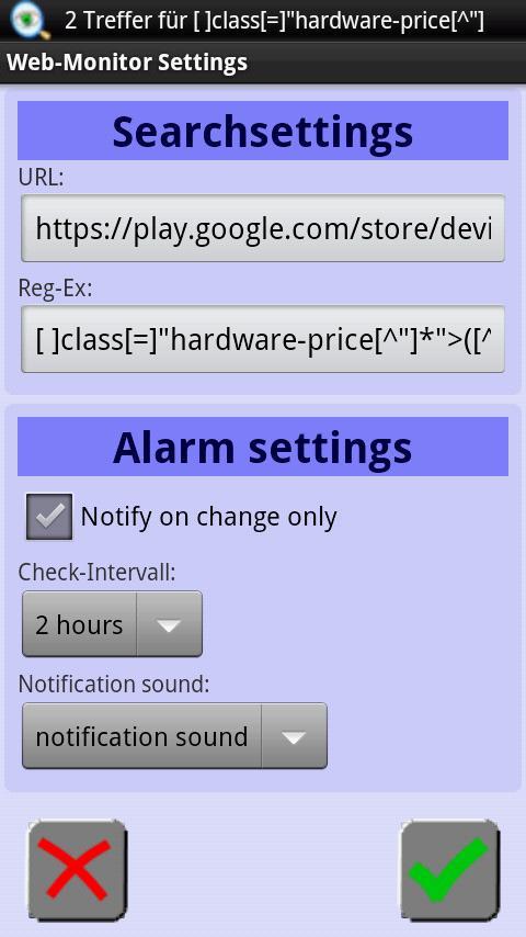 This app polls a configurable web-page in regularly intervals and checks the content for a keyword (defined as regular expressions).