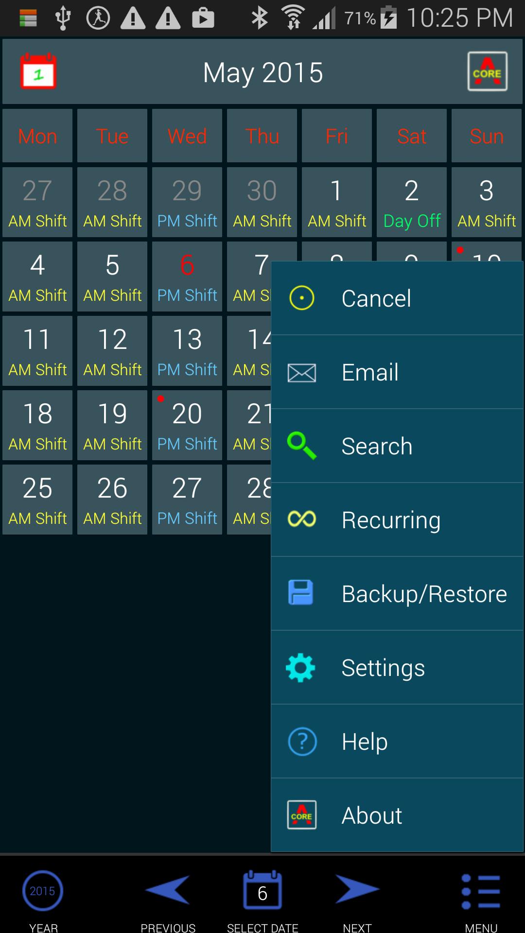 Work Roster is the ultimate calendar for shift works. Easily record and retrieve shift data. Set up recurring shifts, perform database searches, sync to another device and email monthly roster. Fully customizable.