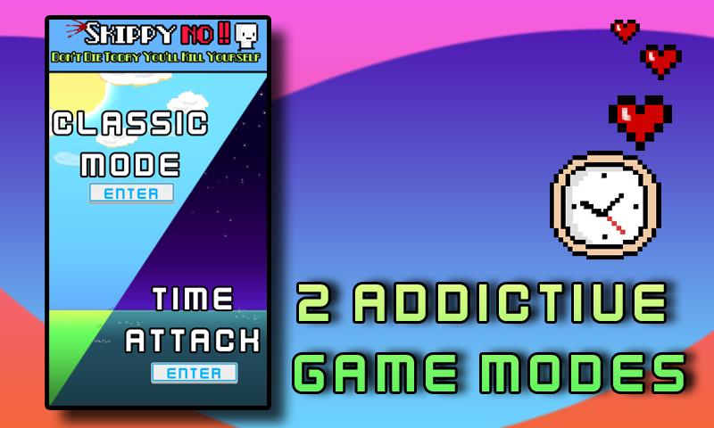 ساعد Skippy في قتل نفسه اليوم والقفز بأعلى قدر ممكن. ما عليك سوى النقر على الشاشة وهو يركض لجعله يقفز ولا يلمس أي منصات.