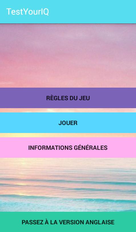 هذا هو أفضل تطبيق IQ مصمم خصيصًا لاختبار الذكاء. التطبيق متاح باللغتين الإنجليزية والفرنسية. يحتوي التطبيق على 15 سؤالًا نصيًا و 5 أسئلة للصور. يمكن استخدام التطبيق على حد سواء في وضع عدم الاتصال عبر الإنترنت.