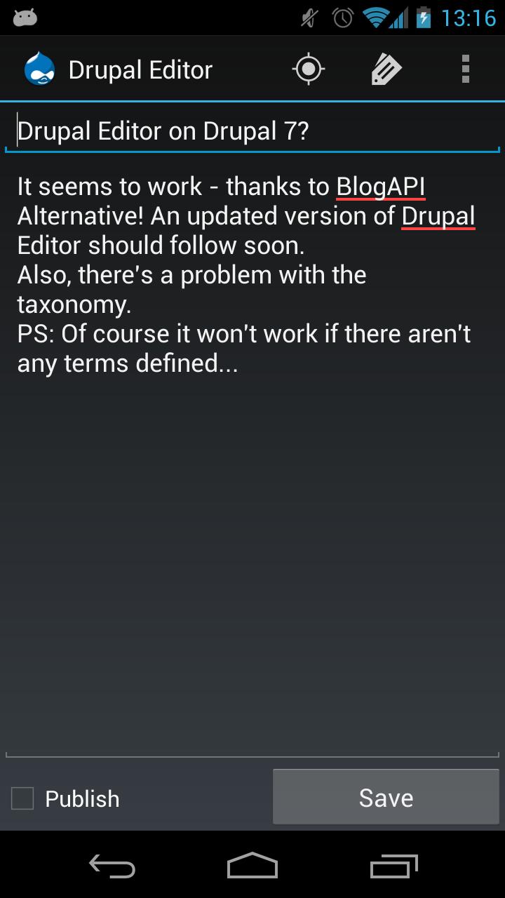 Ermöglicht Ihnen, Artikel auf Websites zu posten und zu bearbeiten, die Drupal verwenden. Sie (oder Ihr Administrator) müssen die Blog -API für das funktionieren. Auf Drupal 7 müssen Sie das Modul "BlogAPI -Alternative" installieren.