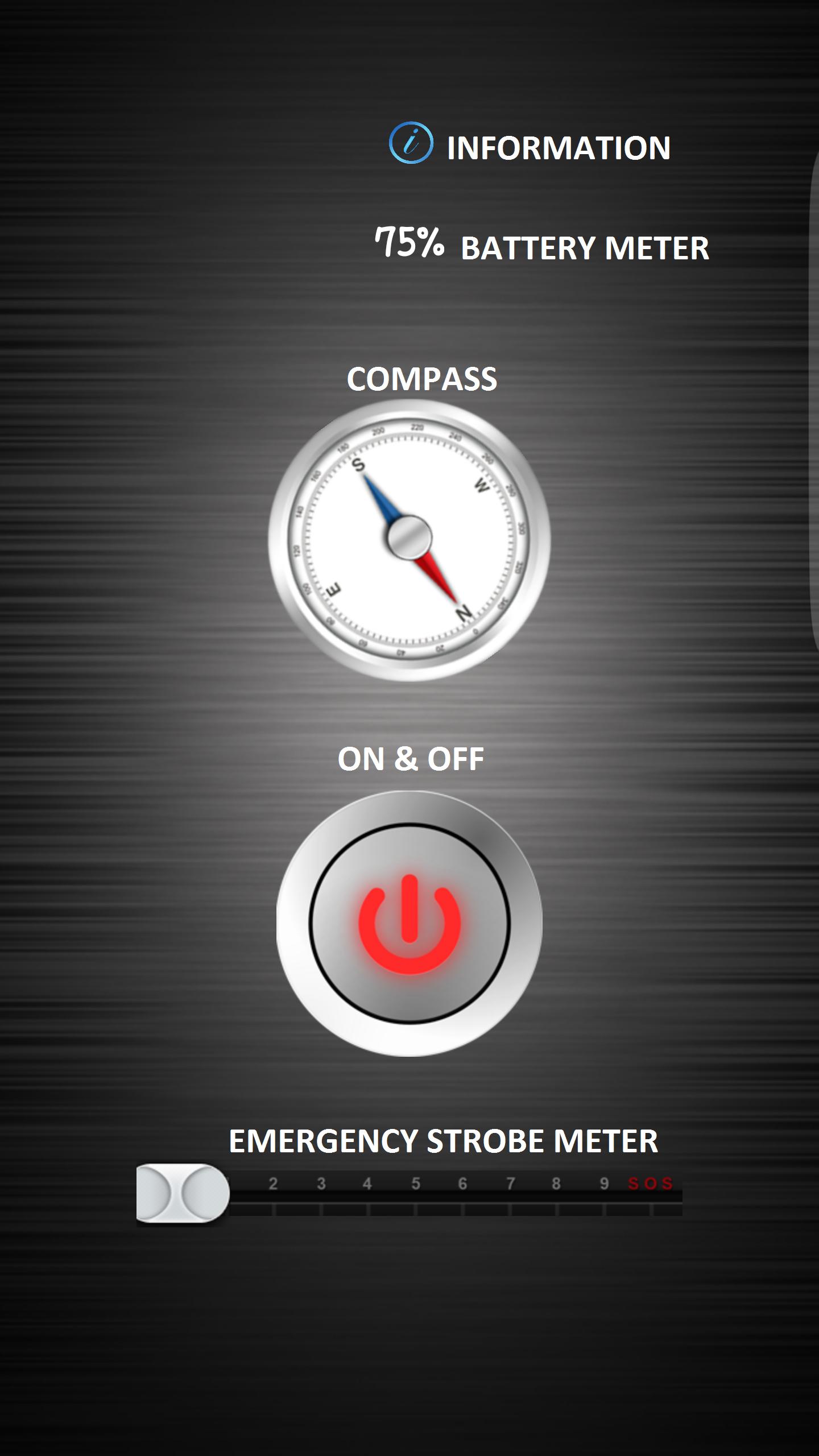 Hellste Taschenlampe mit Kompass- und Batterieinformationen. Mit der SOS -Funktion können Sie das SOS -Signal in Notfällen senden oder anderen erlauben, Sie leicht zu finden. Mit dem integrierten Kompass finden Sie Ihren Weg von überall aus.