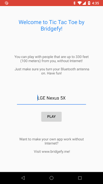 Die Offline-Tic-Tac-Toe-App wird vom Bridgefy SDK angetrieben. Besuchen Sie www.bridgefy.com und erfahren Sie mehr über andere Apps, die ohne Internet funktionieren, und wie Sie Ihre eigene App entwickeln können, die nicht von der Arbeit von Internet abhängt.