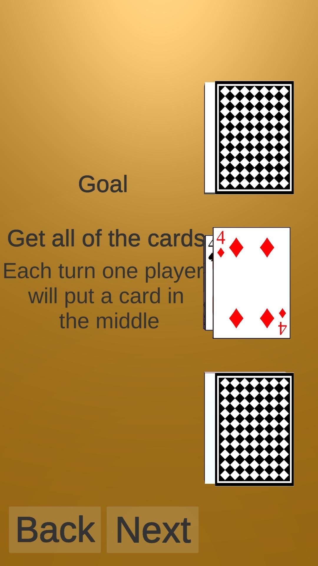 Wenn eine Karte mit dem gleichen Wert wie der darunter ist der Krieg, was bedeutet, dass die Spieler den roten Kriegstaste drücken können. Der erste, der es drückt, nimmt den mittleren Stapel.