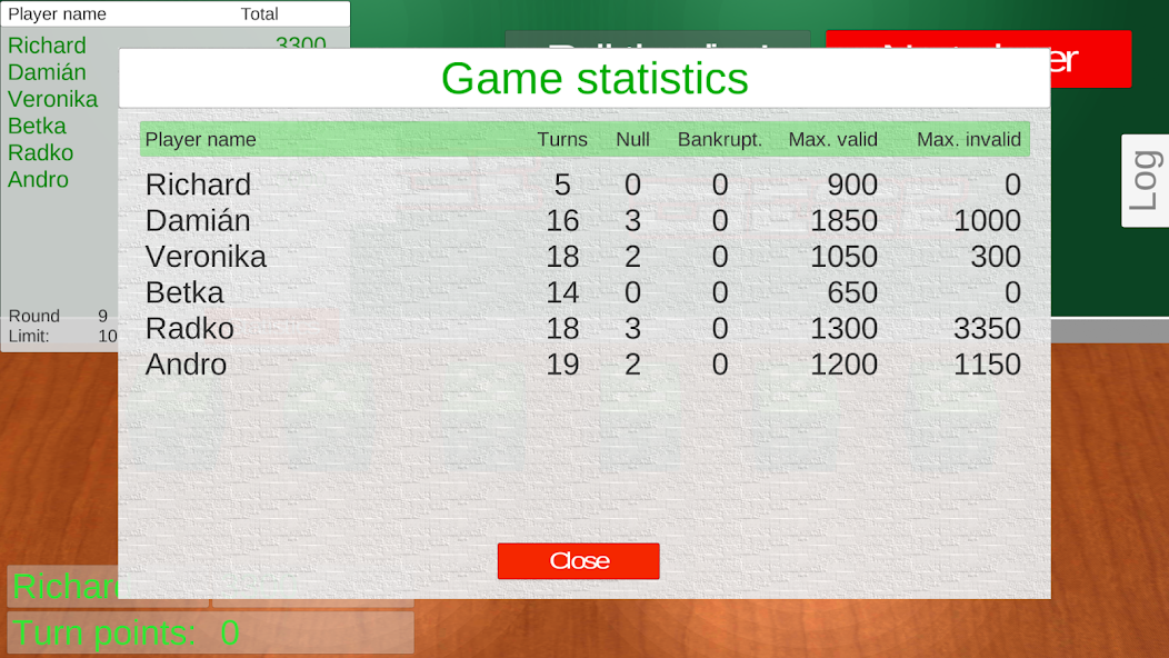 Der Gewinner des Spiels ist der Spieler, der eine definierte Punktgrenze und Runde überschreitet, um den letzten Spieler in der Liste der Spieler herauszunehmen.