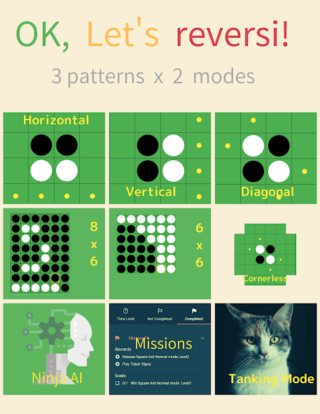 Genießen Sie unser bestes Feature, verrückte Boards mit seltsamen Mustern wie dem schnellen "6x6 -Board" oder einem rechteckigen "8x6 -Board", von denen Sie auch wenn Sie diagonal aus der Ecke angreifen, können Sie immer noch nicht die gegenüberliegende Ecke bekommen! Oder unser einzigartiges "eckloses Brett", auf dem Scheiben nicht an den Ecken gelegt werden können, weil es keine Ecken gibt!
