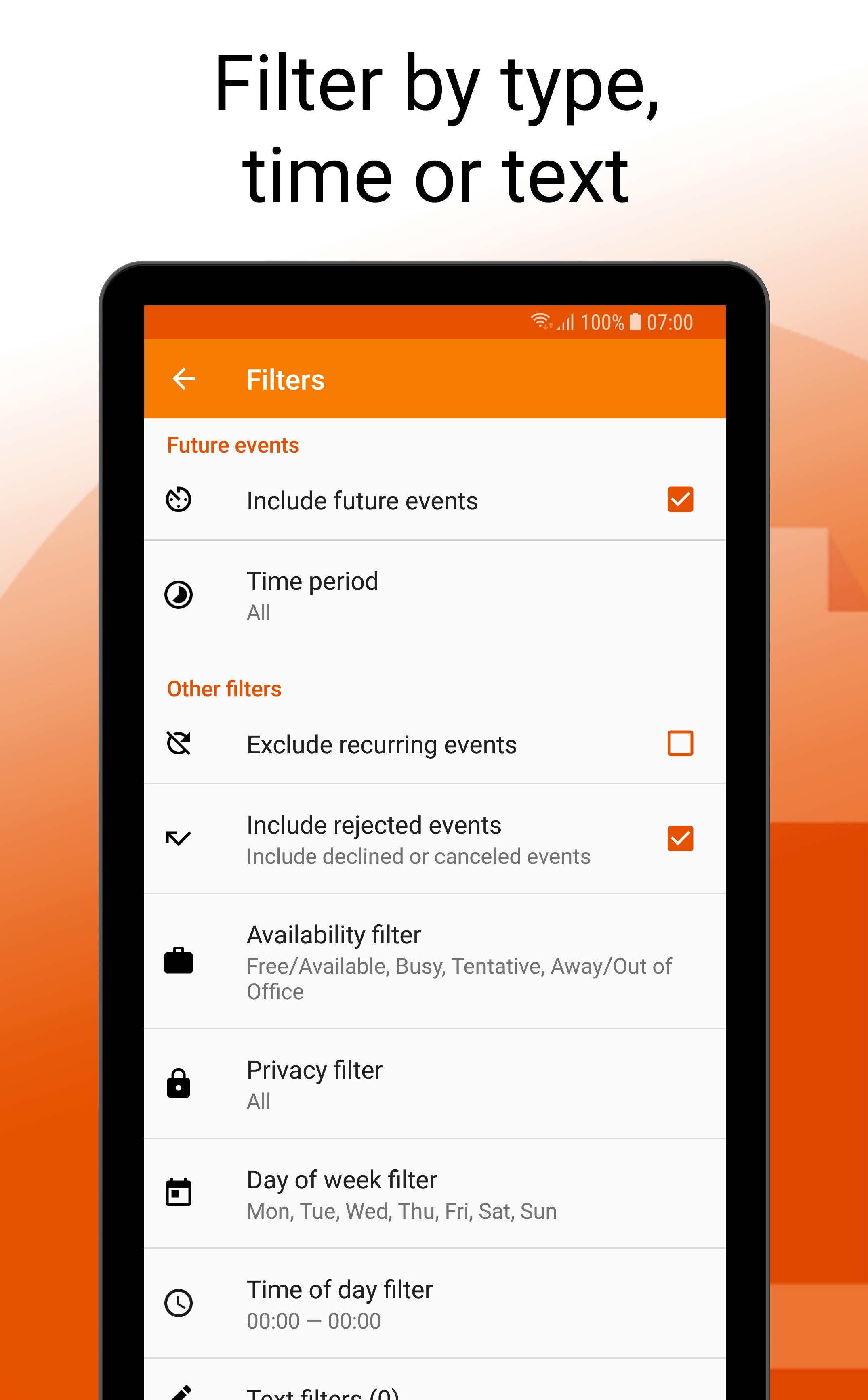 • Opciones de filtro: incluya/excluir eventos pasados, eventos cancelados/rechazados, filtro disponible/ocupado, filtro de privacidad, filtro de día de semana, filtro de hora del día