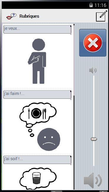 Diseñado para ayudar a las personas con discapacidades del habla a expresar sus necesidades utilizando pictogramas y síntesis de voz de la tableta.