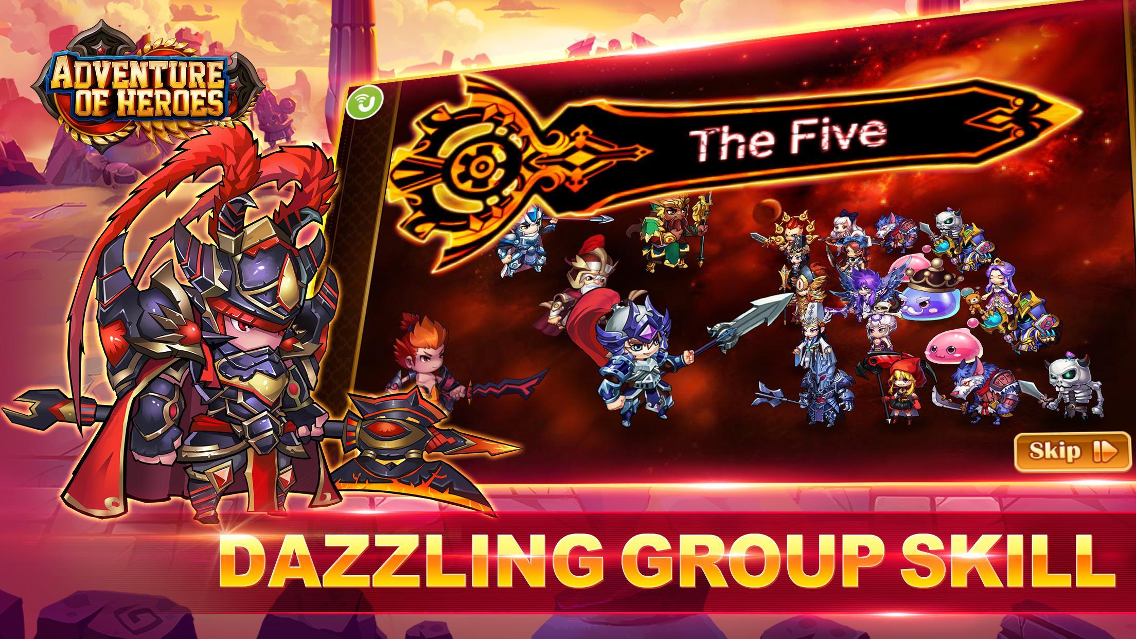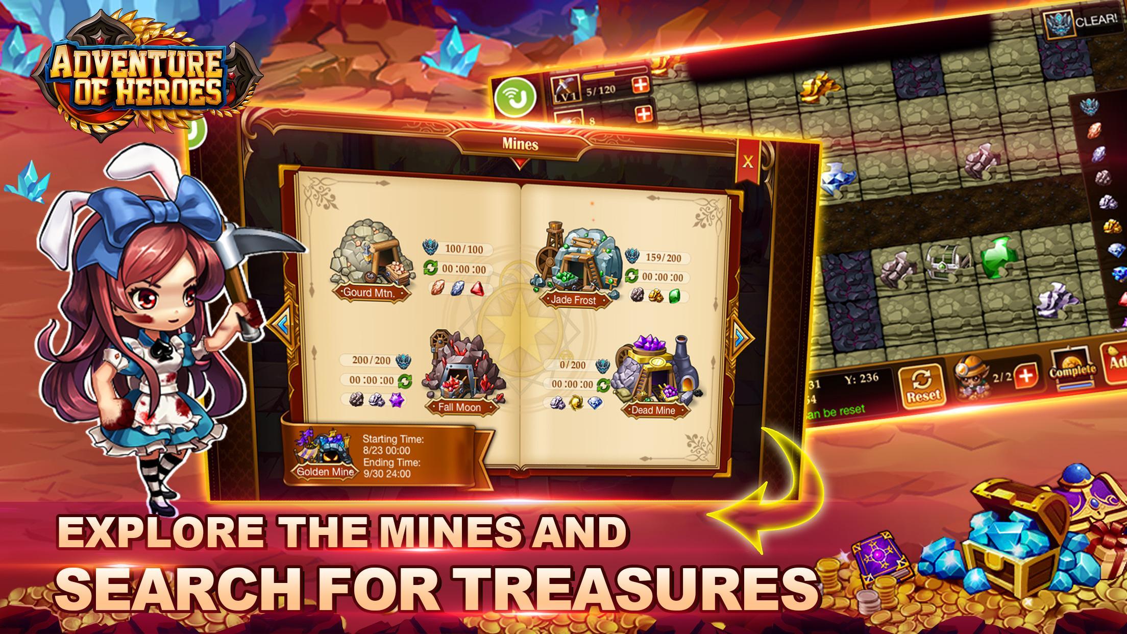 Adventures of Heroes es un juego de rol de tarjeta 2D que se centra en explorar y minería. Su objetivo es formar un poderoso equipo de hasta 20 héroes para pasar por los diferentes desafíos en el mapa, finalmente devolver el libro de dimensiones a su lugar original y salvar al mundo 2D de la corrupción.