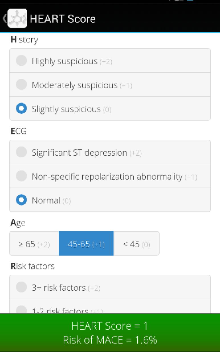• Cardiologie: Heart, Chads2vasc, Brugada, Sgarbossa, Timi