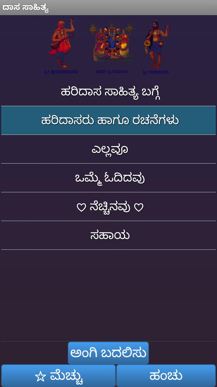 Dasa Sahitya (ದಾಸ ದಾಸ) est la littérature du mouvement Bhakti composée par des fidèles en l'honneur de Lord Vishnu ou de l'un de ses avatars. Dasa est littéralement serviteur à Kannada et Sahitya est la littérature. Haridasas ("serviteurs de Dieu") étaient des prédicateurs de Bhakti à Lord Vishnu ou l'un de ses avatars. La littérature Bhakti de ces Haridasas est collectivement appelée Dasa Sahitya . C'est dans la langue kannada.