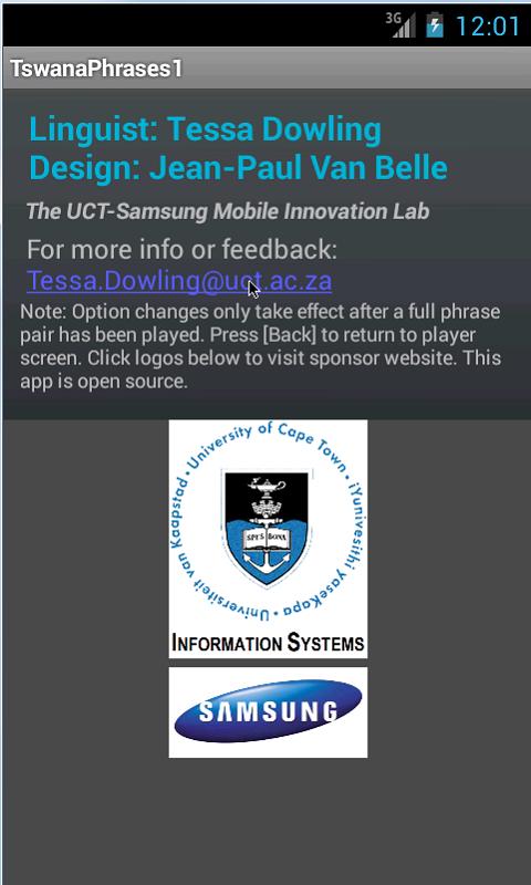 Cette application a été construite dans l'intérêt de faire en sorte que les Sud-Africains se parlent mais peuvent être utilisés par quiconque intéressé à apprendre certaines phrases de base du Tswana. Compact. Facile à utiliser. Cette application a été développée par le Samsung Mobile Innovation Lab de l'Université de Cape Town en tant que collaboration entre Tessa Dowling, African Languages et Jean-Paul Van Belle du Département des systèmes d'information. Également disponible dans quatre autres langues sud-africaines. Tswanaphrases2 a plus de phrases amusantes à maîtriser avec juste un robinet de votre cellule! Également disponible dans quatre autres langues sud-africaines. Trouvez toutes nos applications sur: https://play.google.com/store/apps/developer?id=Information+Systems+dept+-+University+Of+Cape+town.