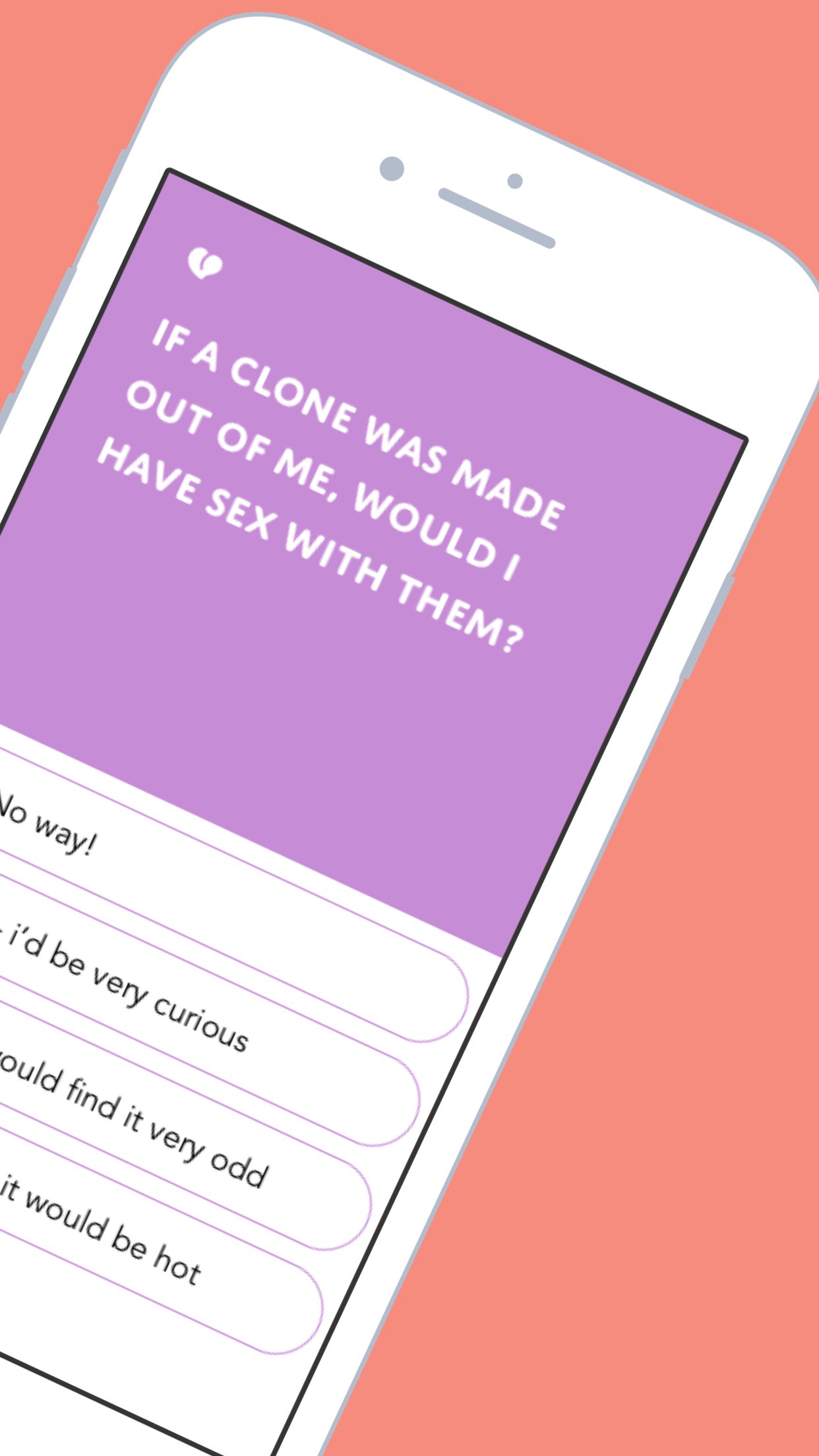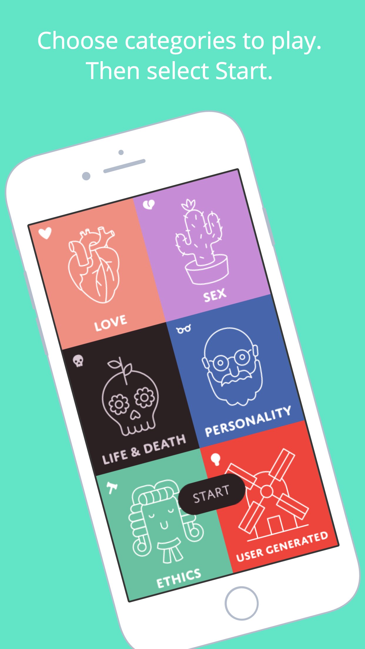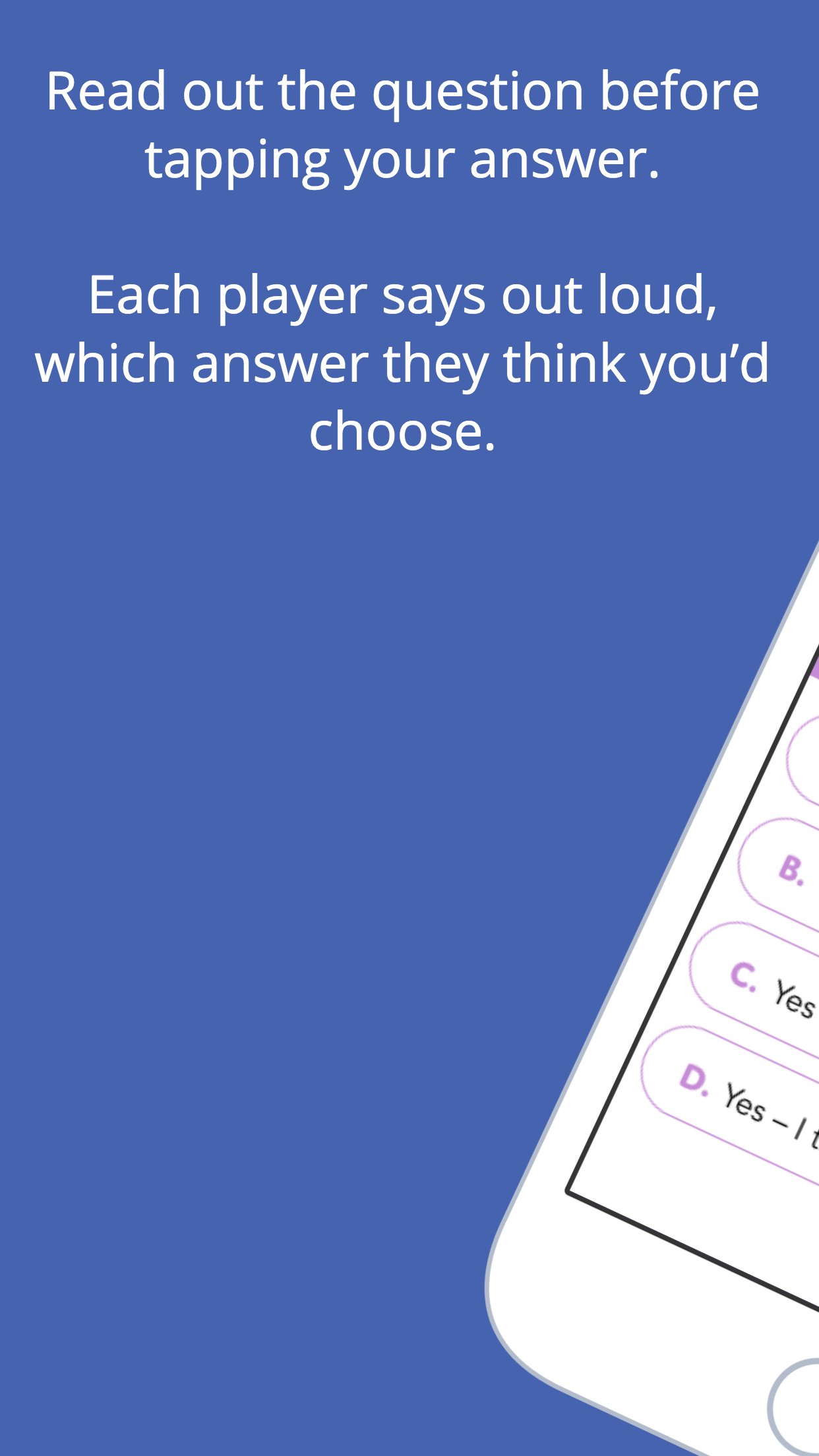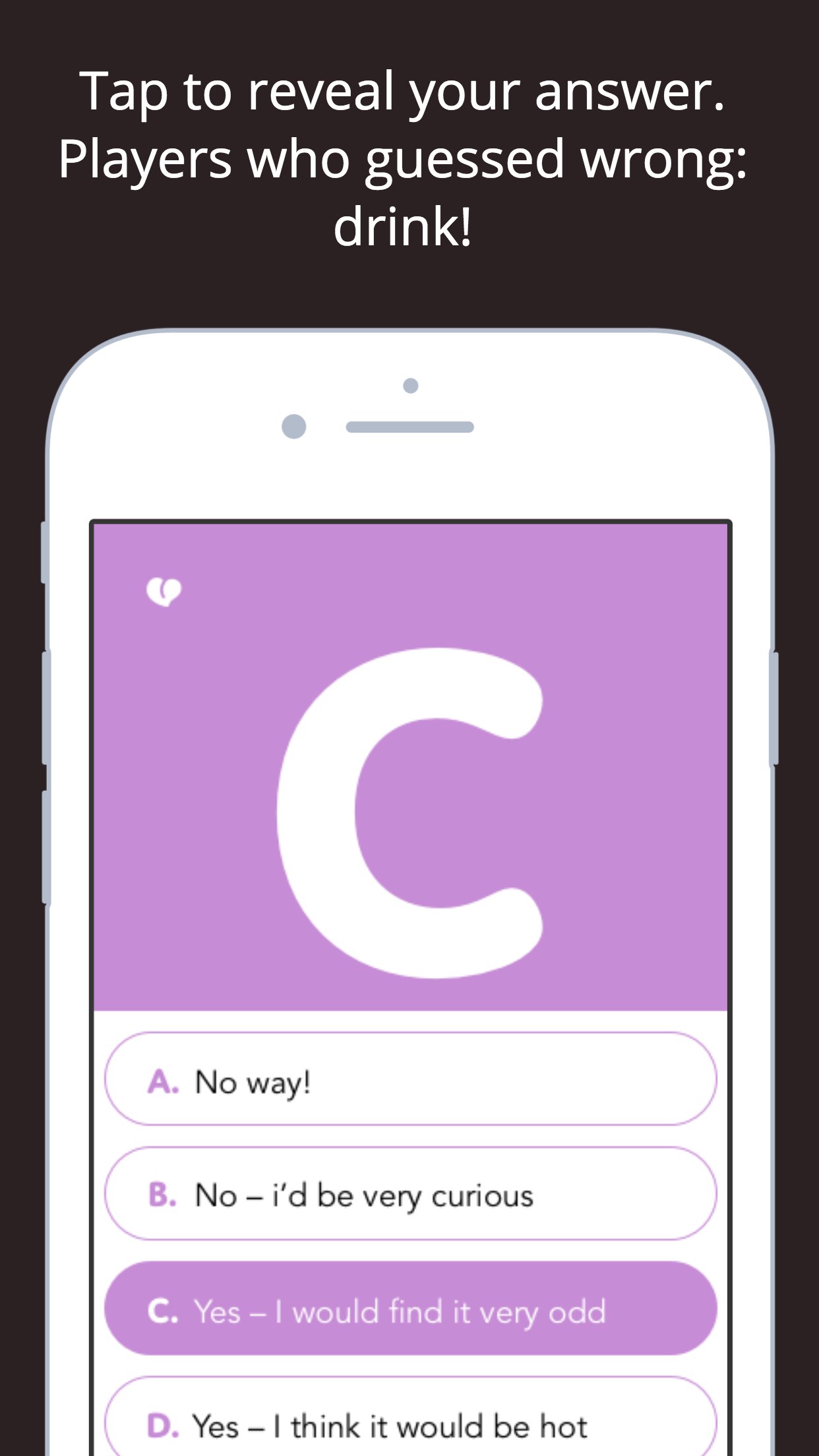 Faites votre choix parmi nos 6 catégories et commencez à répondre aux questions taboues à partir de réponses à choix multiples. Une fois que tout le monde a deviné ce qu'il pense que vous choisiriez, faites glisser votre doigt pour révéler la réponse. Les amis qui se sont trompés doivent boire !
