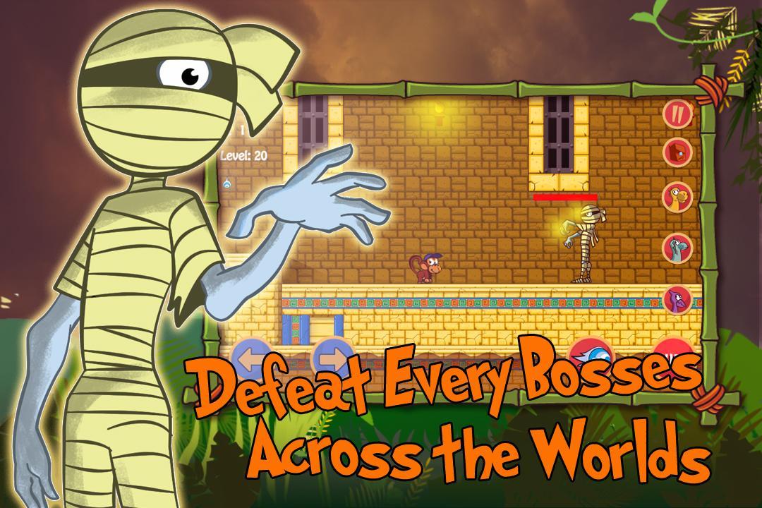 Super Monkey est fait de différents niveaux de jeu; Chacun est unique avec un nouveau niveau de défi et une dynamique impressionnante. Au dernier niveau de chaque monde, le héros devra vaincre le boss final avec différents pouvoirs et capacités….