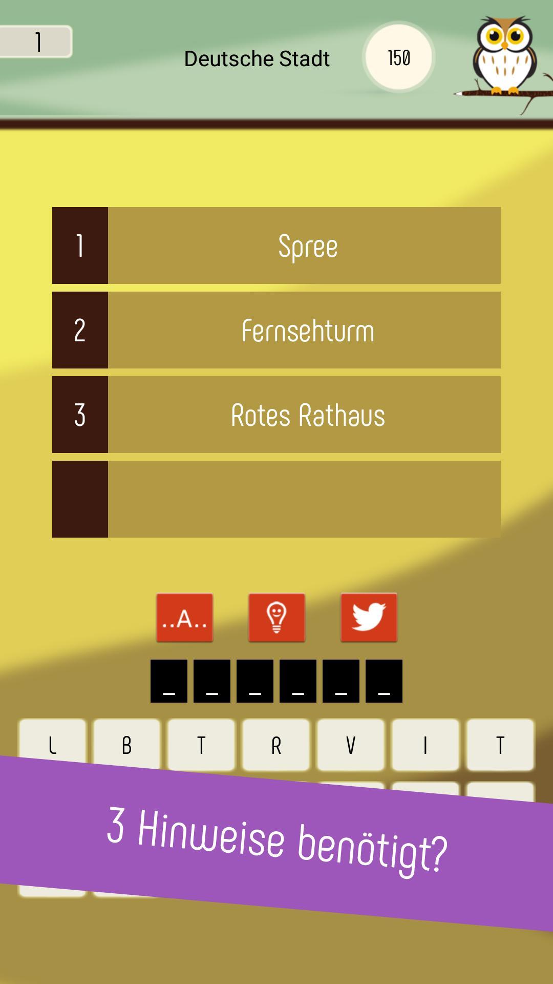 Admittedly, the solutions of this wording/pun are not necessarily easy. But we are not in primary school here either. If we were that, for example, Berlin would search with a bear, the Reichstag and Currywurst. So we are on Google Play and not only offer you a free download. No, since 4 Hinweise 1 Ort are not as easy as drinking water, we give you helpers. And even better - there is a lot of coins per correct solution, so that you can also afford the helpers. We of course reward those who already find the solution to the word puzzles more than those who need all four notes with a hint.
