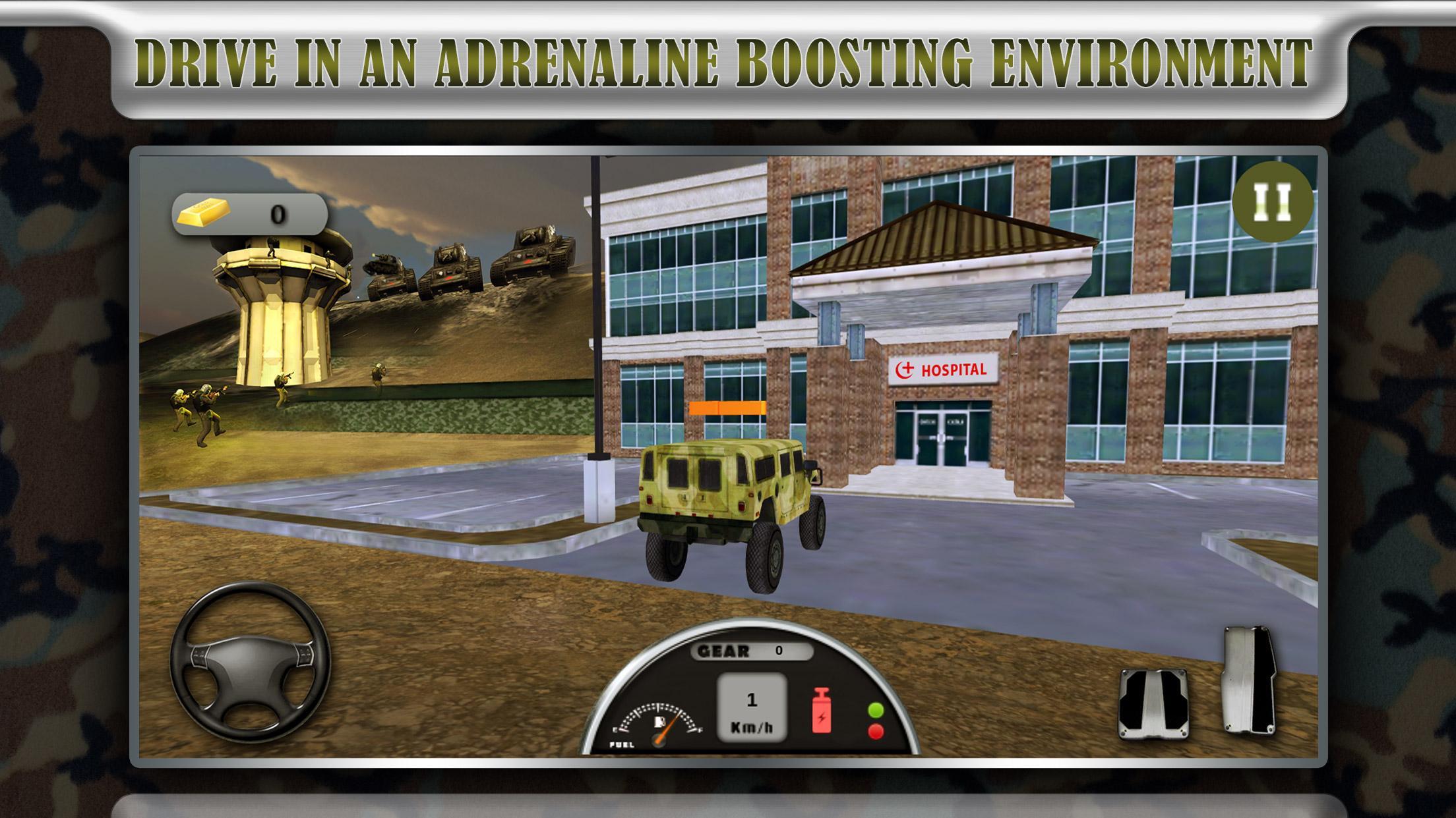 The army base has been struck by a sudden attack by some terrorists. The onslaught has injured a lot of army soldiers, as they attempt to resist the army base from being taken over. Driving an army vehicle, your task is to transport the injured soldiers to the hospital.