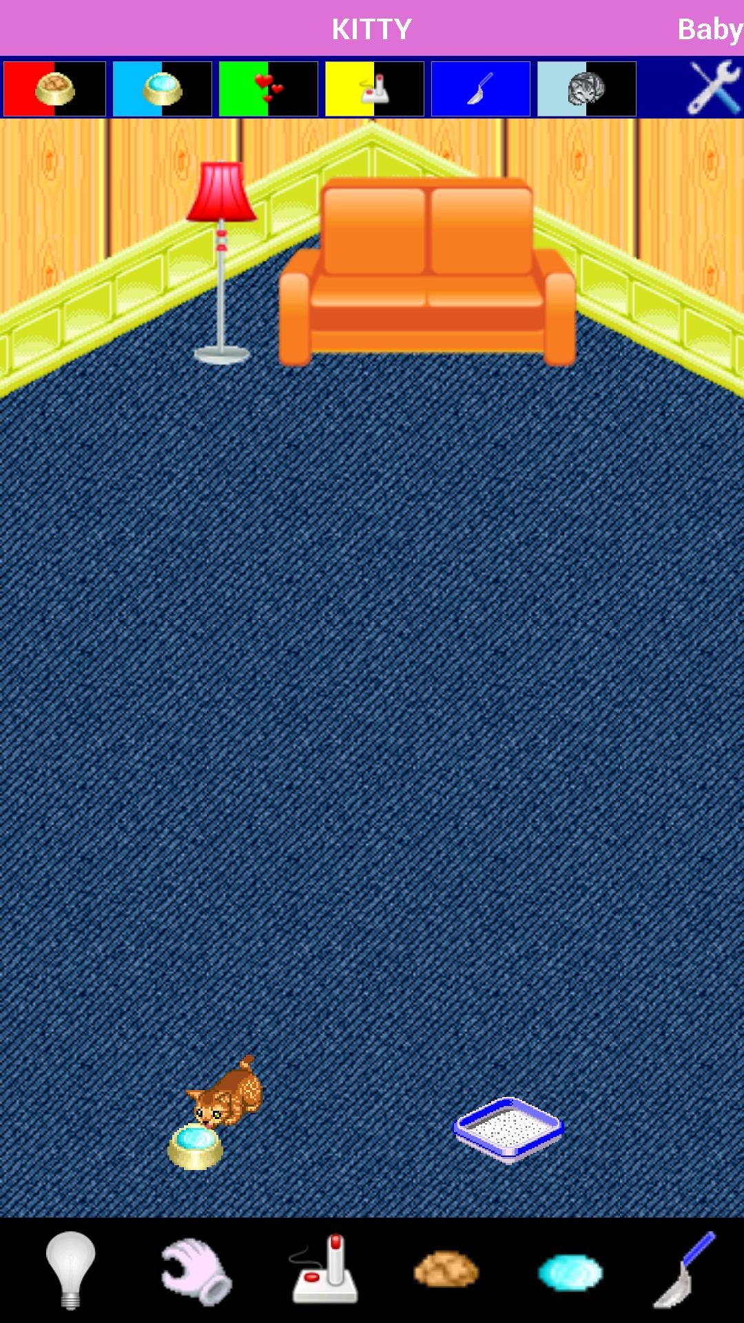 - Lamp: click on it to send your virtual pet to sleep or wake it up. To load up the tiredness bar put your cat in sleep state.