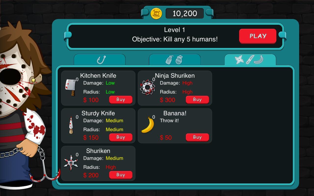 Your task is to kill as many as possible and complete bloody missions. Your arsenal includes hooks, knives, shurikens, regular and gas bombs, and grenades. Collect coins and buy new and more powerful weapons.