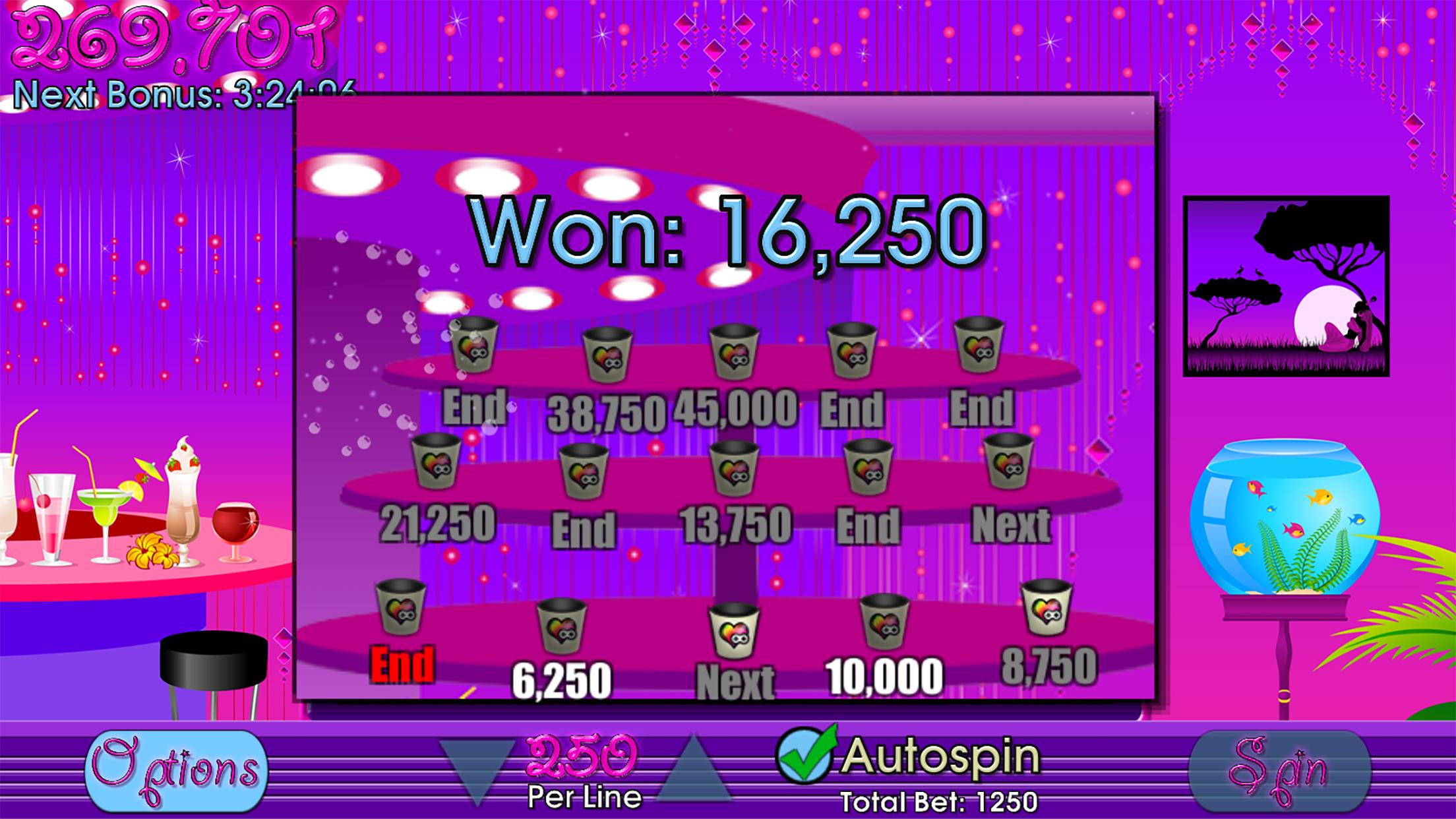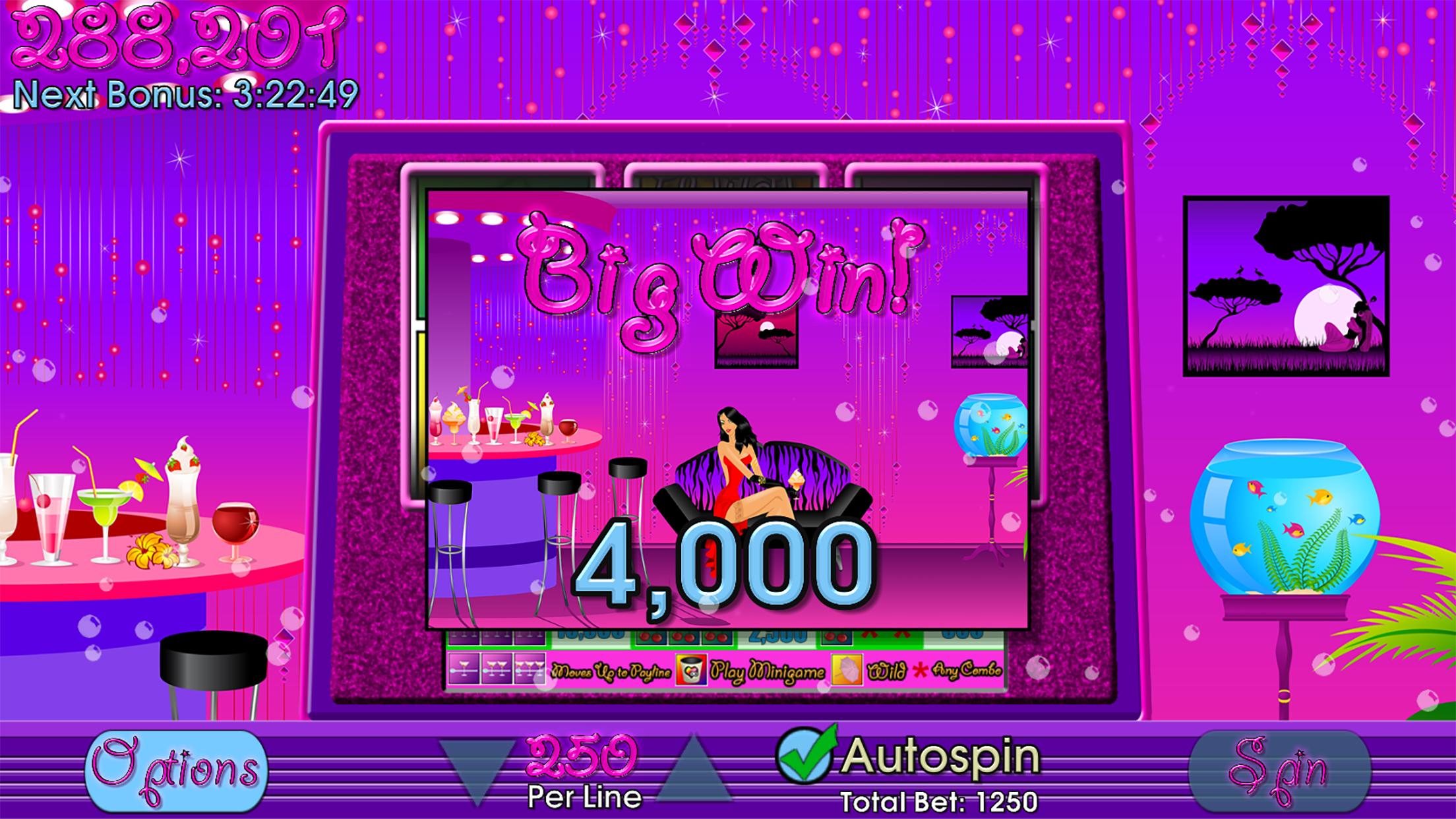 Cocktail Slots has exciting three reel, five pay line slot action like you would find in a casino. Bright colorful graphics, high quality sound, and a fun mini-game.