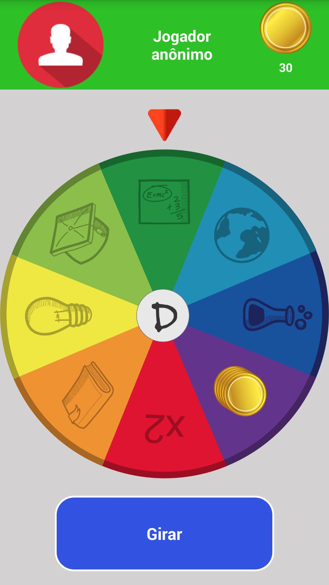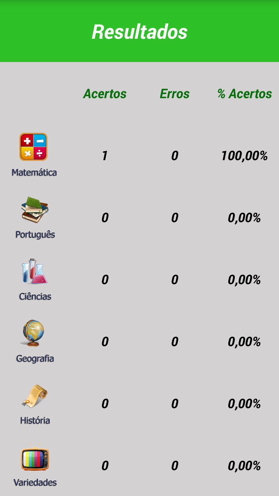 Defying has categories of questions such as: varieties, Portuguese, mathematics, geography, science, history.