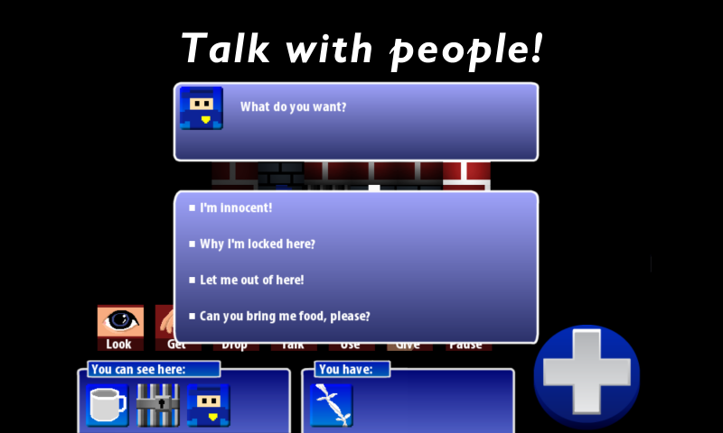 This is an adventure game, but with Rogue-like styled maps. Walk around to find objects, characters and do whatever it takes to escape! But think before you act: one wrong move and you will go back to your cell...