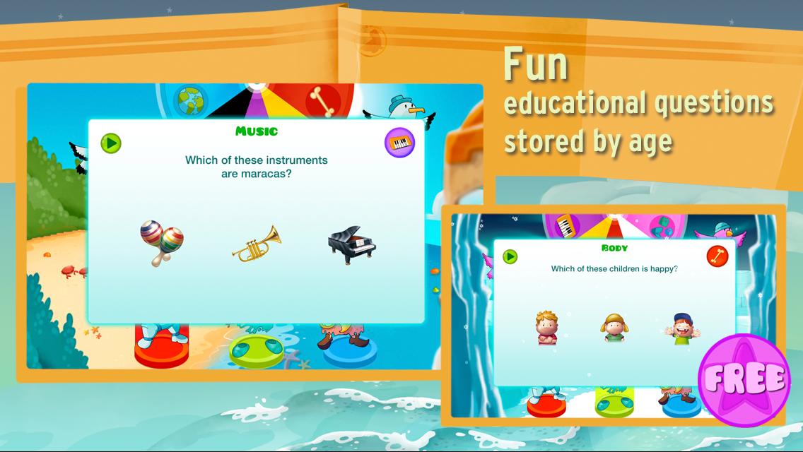 - Seven educational categories (cooking, animals, music, human body, letters, numbers and world traveler) and more than 1,000 questions.