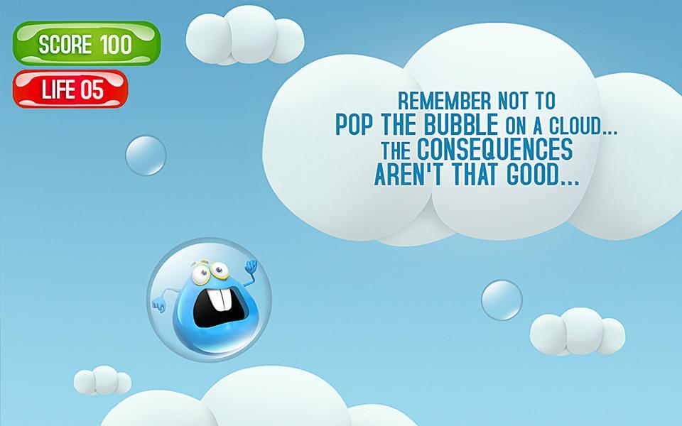 Get into the huge floating bubble and collect more bubbles to proceed... Remember not to pop the bubble on a cloud... the consequences aren't that good...