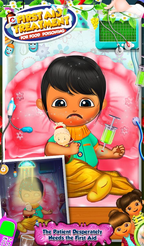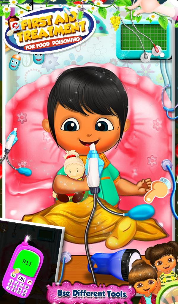 Oh no! Emma, Sophia, Allena and Ruby need doctor immediately. Help those little ones to be themselves when you give them First Aid Treatment. You can use different tools to check her then feed her water to do puke and remove all foodstuff from stomach.