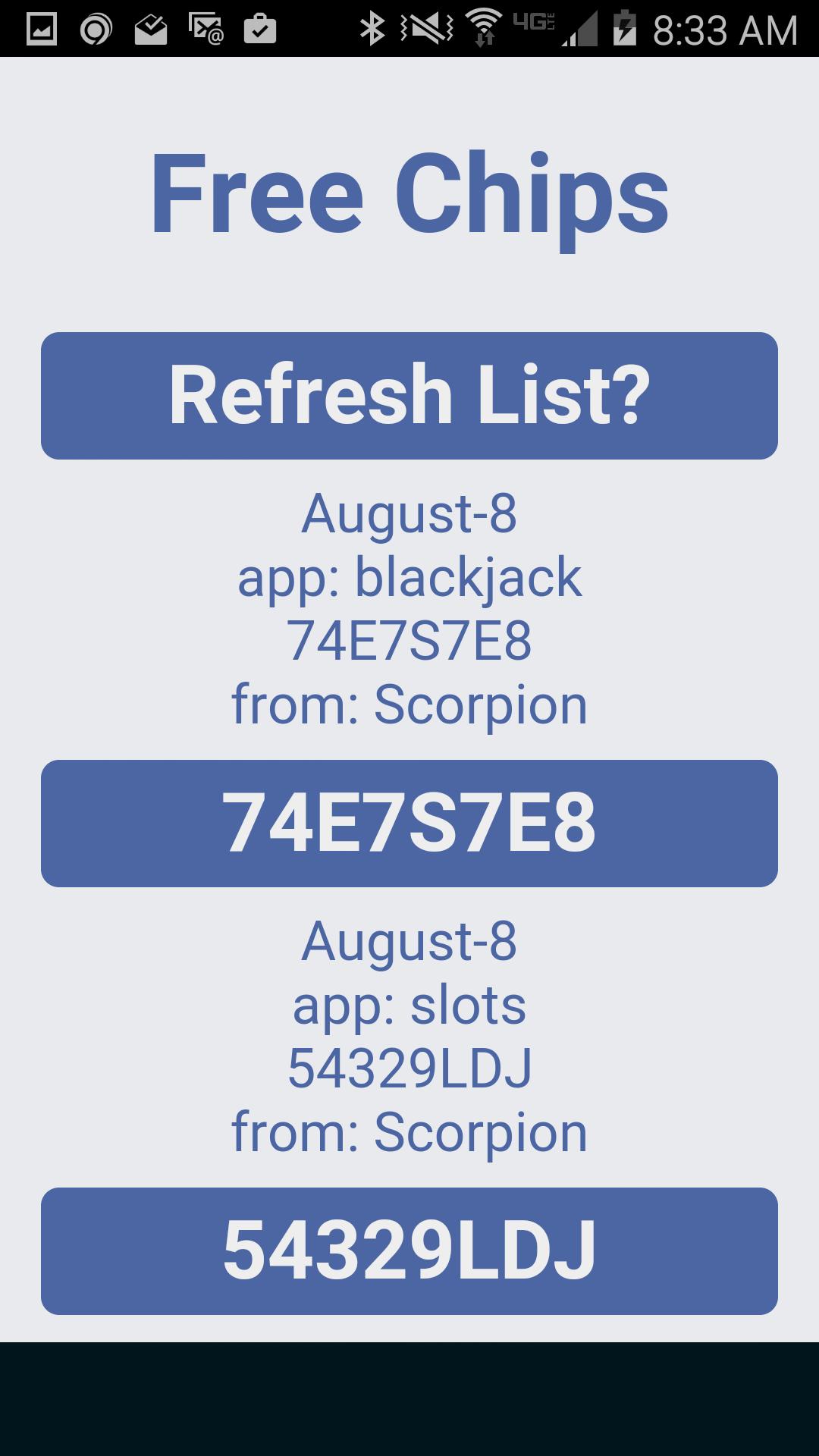 Free Chips allows you to collect Free Chips or mobile coupon codes for you favorite "myVegas" mobile app, whether you play Slots, Konami, BlackJack, or all three, you'll find your mobile coupons here. Free Chips sends you notifications when new mobile coupons are available so you can ensure you collect them all before they expire.