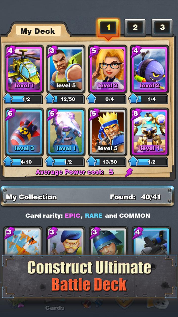 Recruit and upgrade powerful troops. Build up your army to prepare for battle. Destroy the enemy Guard Towers and Command Towers to defeat your opponents and win scores and glory on various battlefields. Form a Alliance with others to share cards and gain experience.
