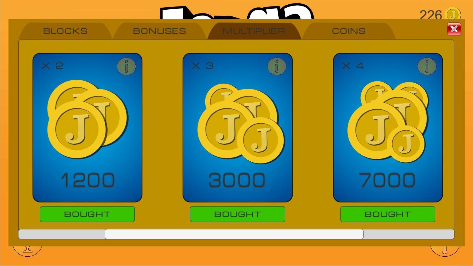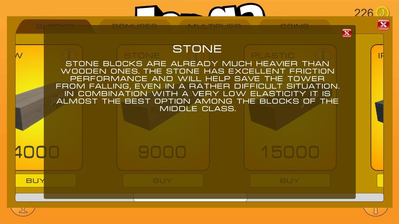 In the game you are waiting for 2 main modes - Campaign, with the passage of which will open all new levels and game modes, and the Battle against the computer - fan mode, illustrating the process of classical Djenga. In the process of passing you will receive JenCoins - a special currency for which you can pump your tower, the number of coins received and buy cool and useful bonuses!