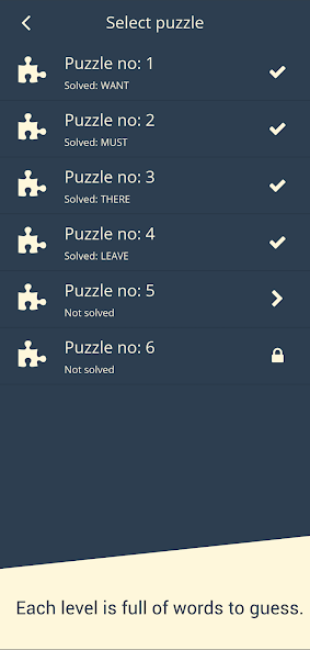 ◾ The game contains dozens of levels (themes). Each level is a dozen words to guess. You have to guess the words in order to unlock the next level.