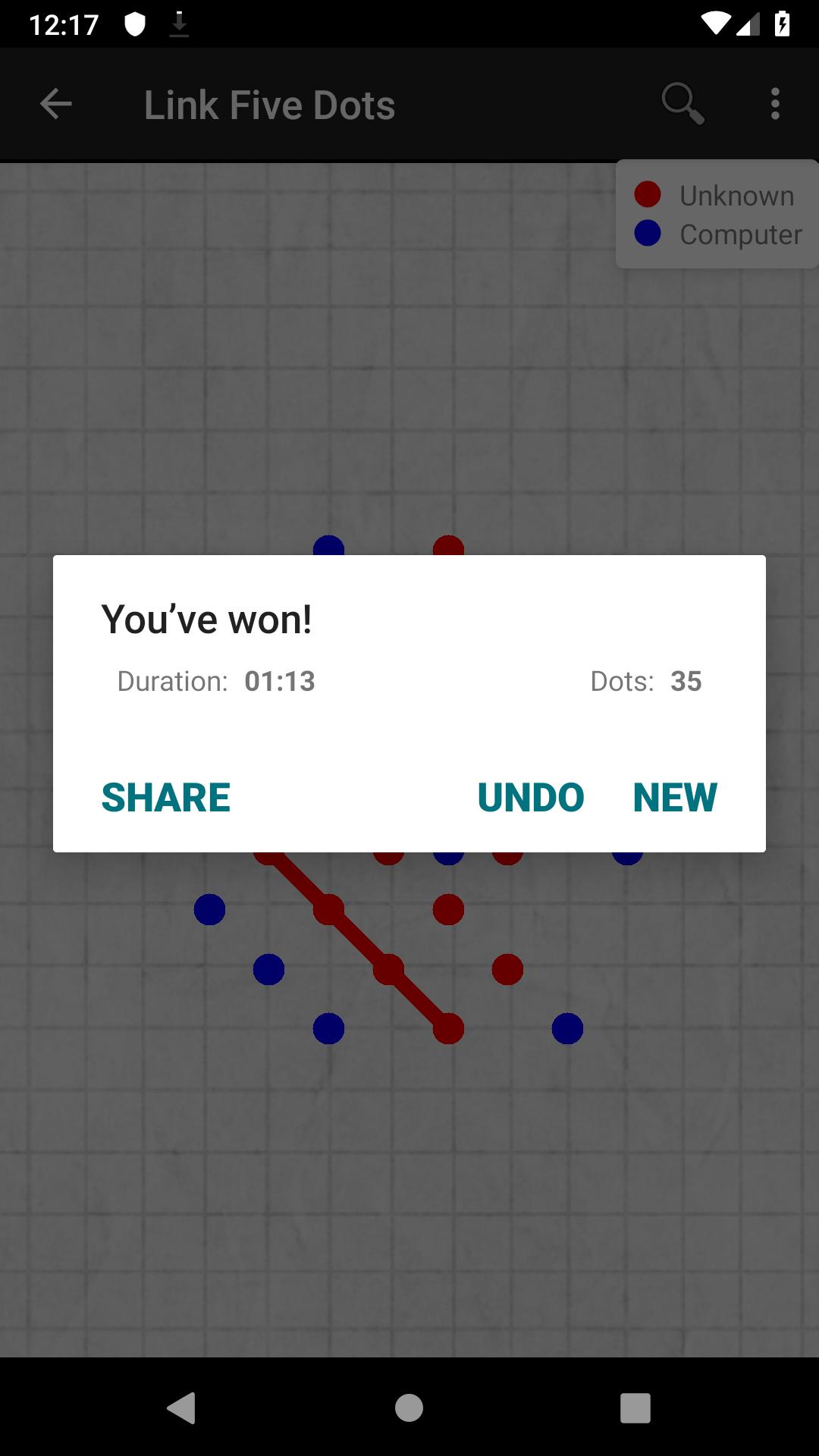 Be the first to Link Five Dots in a straight line horizontally, vertically or diagonally. Android plays blue dots, you play red dots. Red and blue dots are put in turn on the line intersections. The first move is yours.